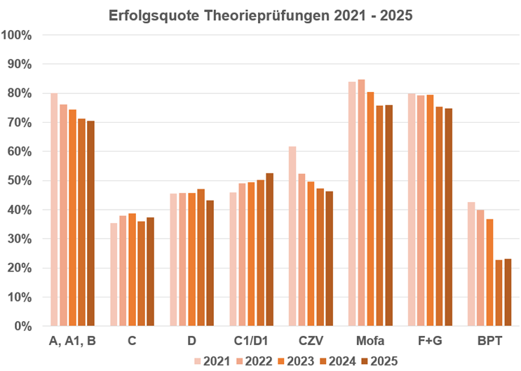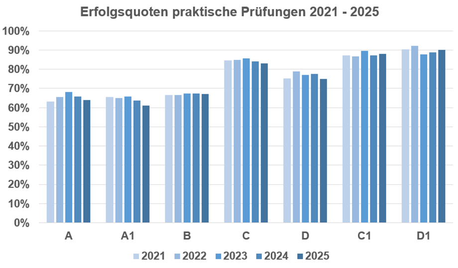 Die Erfolgsquoten der praktischen Führerprüfungen bleiben 2025 insgesamt stabil. Die Werte entsprechen weitgehend denen der Vorjahre, ohne dass sich ein klarer Trend abzeichnet.