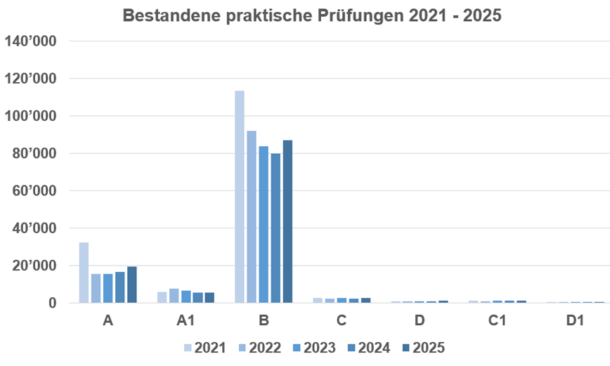 Die Entwicklung der Anzahl Führerprüfungen in der Schweiz zeigt 2025 eine Normalisierung in allen Kategorien. Die Anzahl der Führerprüfungen in Theorie und Praxis lag in den kantonalen Strassenverkehrsämtern von 2020 bis 2021 deutlich über dem langjährigen Durchschnitt. Die Gründe für diesen Anstieg während dieser zwei Jahre waren neue gesetzliche Bestimmungen für die Erlangung der Motorradausweise, Änderungen in der Zweiphasenausbildung bei Neulenkenden und das «Fahren ab 17 Jahren».
