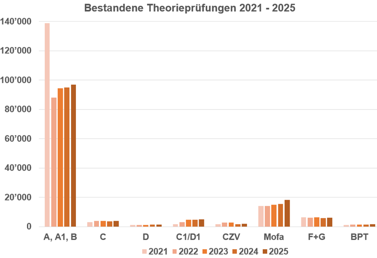 Die theoretischen Prüfungen haben 2025 in allen Kategorien erneut zugenommen.